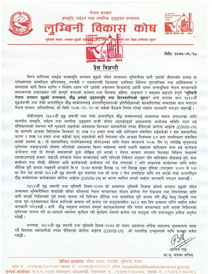 तर विश्वभर महामारीको रूपमा फैलिएको कोरोना भाइरसका कारणले सबै कार्यक्रम स्थगित गरिएको हो । लुम्बिनी विकास कोषले एक बिज्ञप्ति जारी गर्दे उक्त कुरा उल्लेख गरेको छ । बिज्ञप्ति अनुसार २५६४ औं बुद्ध जयन्ति मूल समारोह समिति तथा सोभन्दा दुई दिनअगाडिका लागि तय भएको दोस्रो अन्तराष्ट्रिय बौद्ध सम्मेलनका कार्यक्रमहरु कोरोना भाइरसका कारण स्थगित गरिएको छ ।