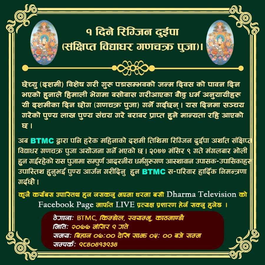 बुद्धिष्ट टिचिंग एण्ड मेडिटेसन सेन्टरले हरेक महिनाको दशमी तिथिमा एकदिने रिग्जिन दुईपा अर्थात् विद्याधर गणचक्र पूजा आयोजना गर्ने भएको छ । पहिलो पूजा भोली मंसिर ९ गते हुँदैछ । काठमाडौँको किमडोल, स्वयम्भूमा पूजा गरिने बि.टि.एम.सी.का प्रमुख खेन्पो सोनाम गुर्मे तामांगले जानकारी दिदै पूजामा सहभाग हुन आग्रह पनि गरेका छन् ।