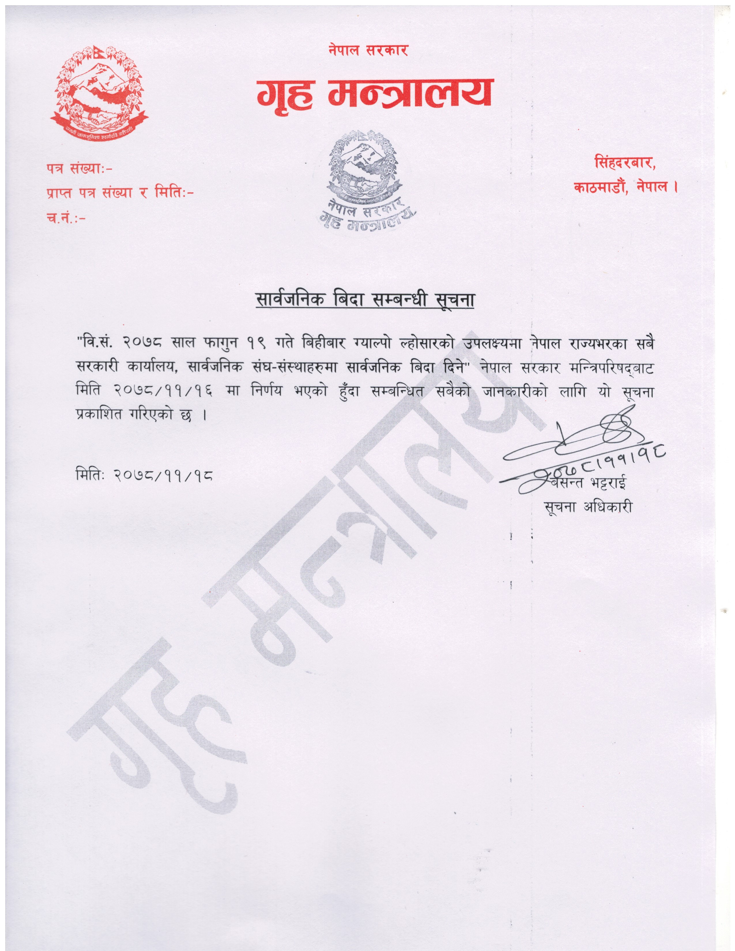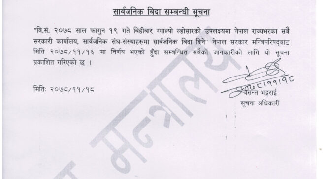 मन्त्रालयकाे सूचनाअनुसार भोलि सबै सरकारी कार्यालय, सार्वजनिक सङ्घ–संस्था बन्द हुने भएका छन् ।