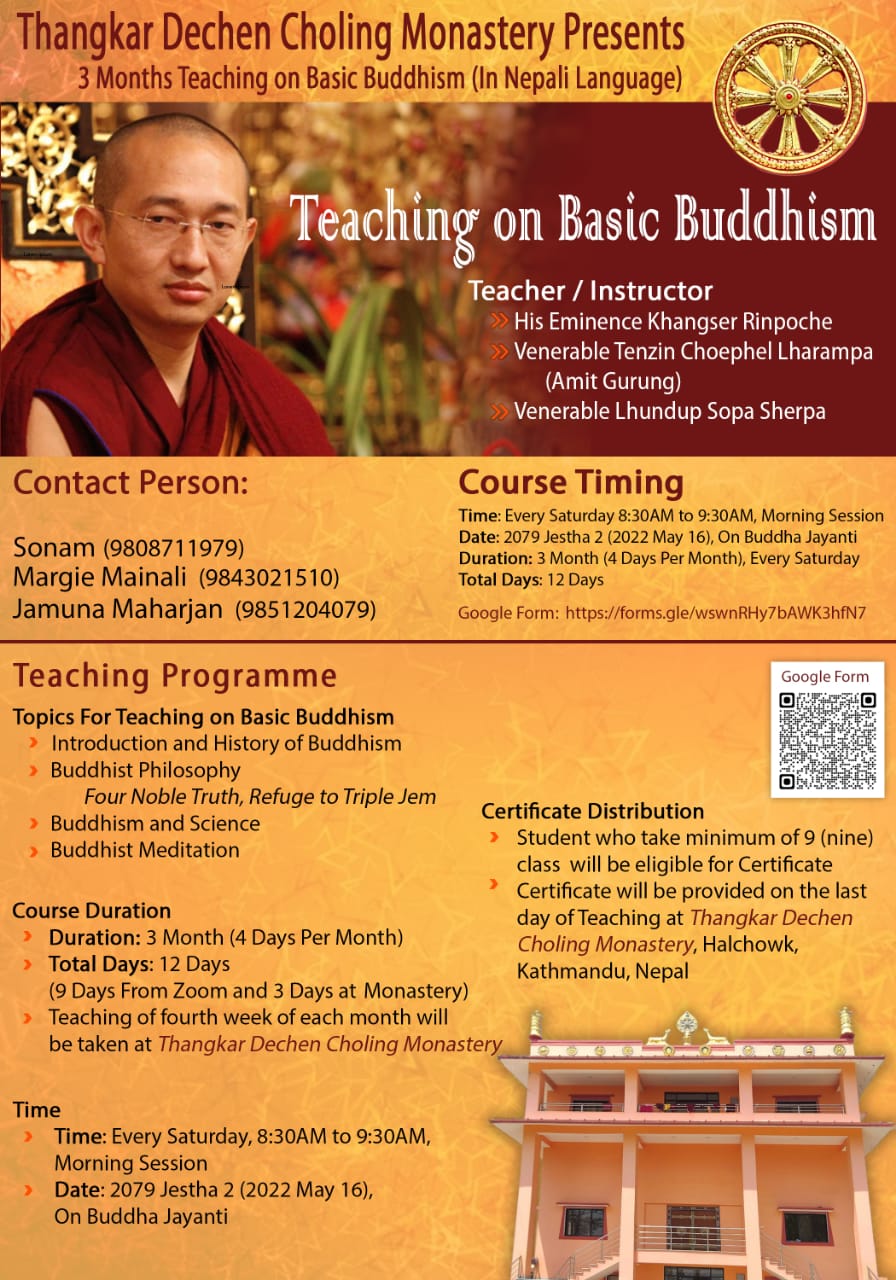 थाङ्कर देचेन चोलिङ गुम्बाद्वारा प्रायोजनमा तीन महिने आधारभुत बौद्ध धर्म देशना हुने भएको छ । धर्मदेशनामा शिक्षक तथा प्रशिक्षकको रुपमा श्रद्धेय खंग्सेर रिन्पोछे, श्रद्धेय तेन्जिन छोपेन ल्हारम्पा –अमिन) र श्रद्धेय ल्हुन्दुप सोपा शेर्पा रहनु भएको छ ।