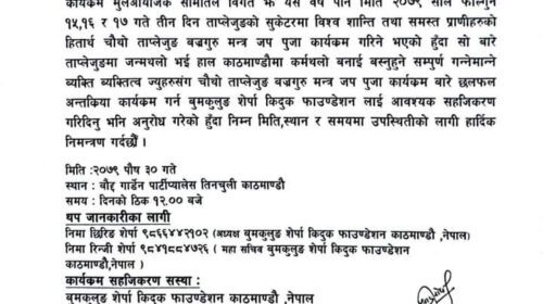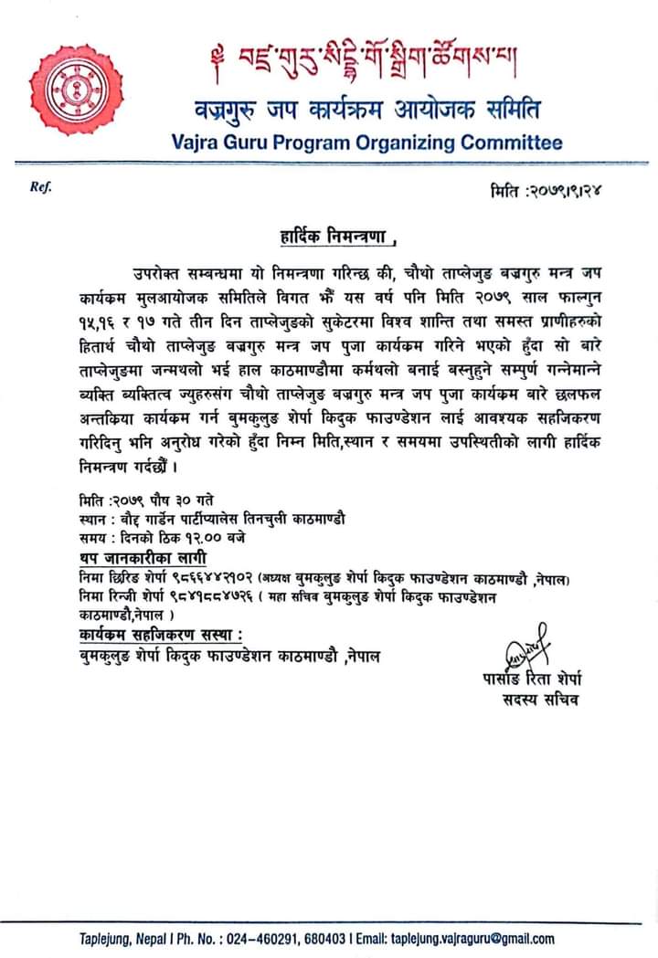 वज्रगुरु जप कार्यक्रम मुल आयोजक समितिले कार्यक्रम सम्बन्धी छलफल र अन्तरक्रिया गर्न पुस ३० गते काठमाडौँको तीनचुलीमा कार्यक्रम राखेको छ । उक्त कार्यक्रममा ताप्लेजुङ जन्मथलो भई काठमाडौंमा बसोबास गरिरहेका उपस्थित हुन आयोजकले आग्रह गरेको छ । वज्रगुरु जप कार्यक्रमको सहजीकरण संस्था वुमकुलुङ शेर्पा किदुक फाउण्डेसन रहेको छ ।