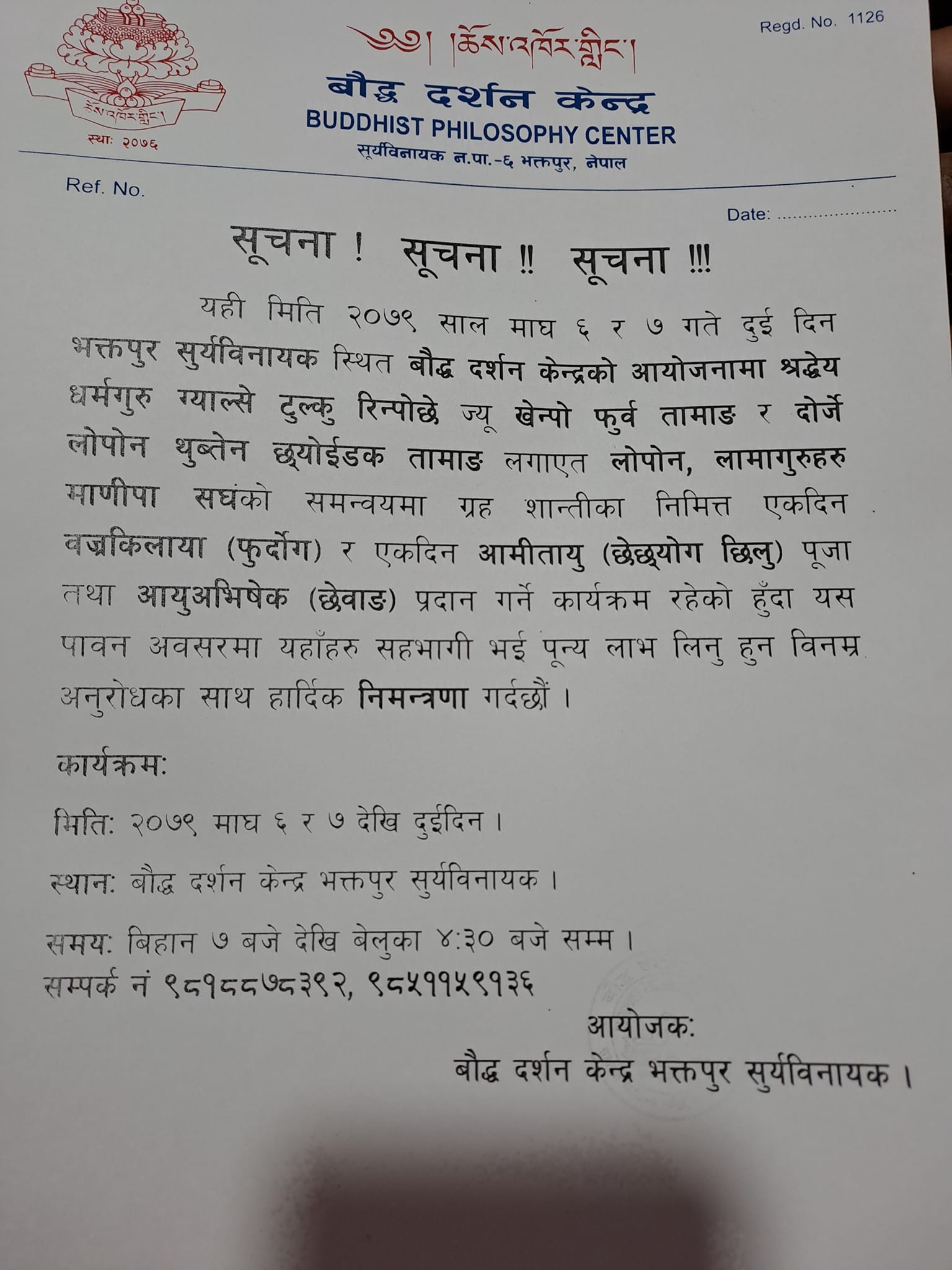 भक्तपुरको सुर्यविनायकस्थित बौद्ध दर्शन केन्द्रको आयोजनामा वज्रकिलाय फुर्पा र एक दिन आमितायु छेछ्योग पूजा आयोजना गरिने भएको छ । पूजा माघ ६ र ७ गते गरिदैछ । उक्त कार्यक्रममा श्रद्धेय धर्मगुरू ग्याल्शे टुल्कु रिन्पोछेज्यूद्वारा छेवाङ आयुअभिषेक समेत प्रदान गरिदैछ ।