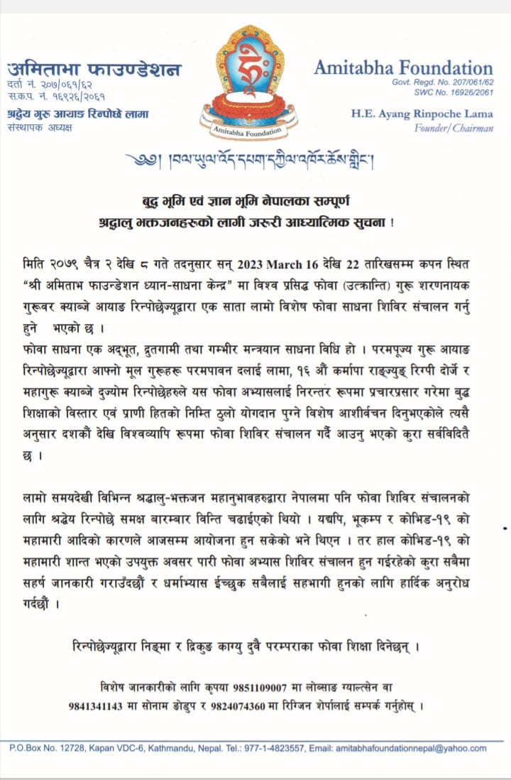 २०७९ चैत्र २ देखि ८ गते तदनुसार सन् २०२३ मार्च १६ देखि २२ सम्म काठमाडौँंको कपनस्थित “श्री अमिताभ फाउन्डेशन ध्यान–साधना केन्द्र“ मा विश्व प्रसिद्ध फोवा (उत्क्रान्ति) गुरू शरणनायक गुरूवर क्याब्जे आयाङ रिन्पोछेज्यूद्वारा एक साता लामो विशेष फोवा साधना शिविर संचालन गर्नु हुने भएको छ ।