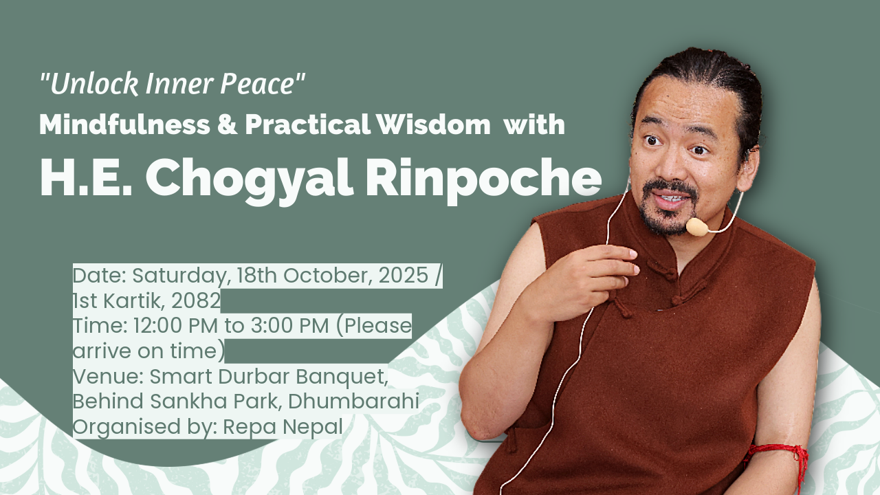 Mindfulness & Practical Wisdom: परमपूज्य छोग्याल रिन्पोछेसँग मनलाई शान्त पार्ने कला। के तपाईं आजको दौडधुप र कोलाहलपूर्ण जीवनबाट एक क्षण विश्राम लिन चाहनुहुन्छ? के तपाईंको मनमा उठ्ने हजारौं विचारहरूको भीडलाई शान्त पारेर जीवनमा स्पष्टता र गहिरो सन्तुष्टि खोज्ने चाहना छ? यदि तपाईंको उत्तर ‘हो’ हो भने, हामी तपाईंका लागि एक यस्तो अनुपम अवसर लिएर आएका छौं, जहाँ तपाईंले आफ्नो जीवनलाई नयाँ दृष्टिकोणबाट हेर्न सिक्नुहुनेछ। हामी गर्वका साथ प्रस्तुत गर्दछौं – “Mindfulness & Practical Wisdom” (सचेतता र व्यावहारिक ज्ञान), एक यस्तो अद्वितीय सत्सङ्ग जसले तपाईंलाई वर्तमानमा जिउन र हरेक पललाई पूर्णताका…